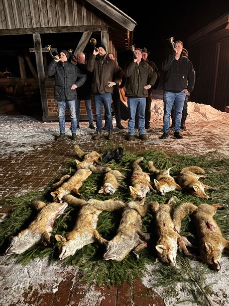 Fuchs- und Krähenwoche 2026: In der Woche vom 23. Januar – 30. Januar rief der Hegering zur Fuchs- und Krähenwoche auf. Am Fr. 30. Januar erfolgte das gemeinsame Streckelegen mit geselligem Beisammensein. Jens Holste konnte den Pokal zum vierten Mal erringen und übernahm diesen vom Hegeringleiter Joachim Schulze. Insgesamt kamen elf Füchse und zwei Krähen zur Strecke: