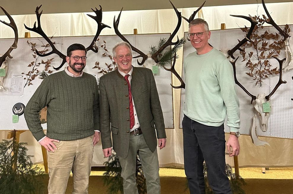 Bildunterschrift: Michael Becher (stellv. Hegeringleiter), Joachim Schulze (Hegeringleiter) und Bürgermeister Joachim Rüter im fröhlichen Austausch vor der Trophäenwand des Hegering Wietzendorf.